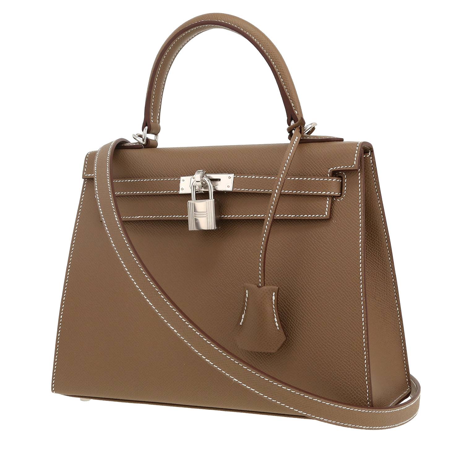 Splendida borsa Hermès Kelly 25 cm in pelle Epsom etoupe, inserti in palladio, manico semplice in pelle etoupe, tracolla removibile in pelle etoupe da portare a mano o in spalla.