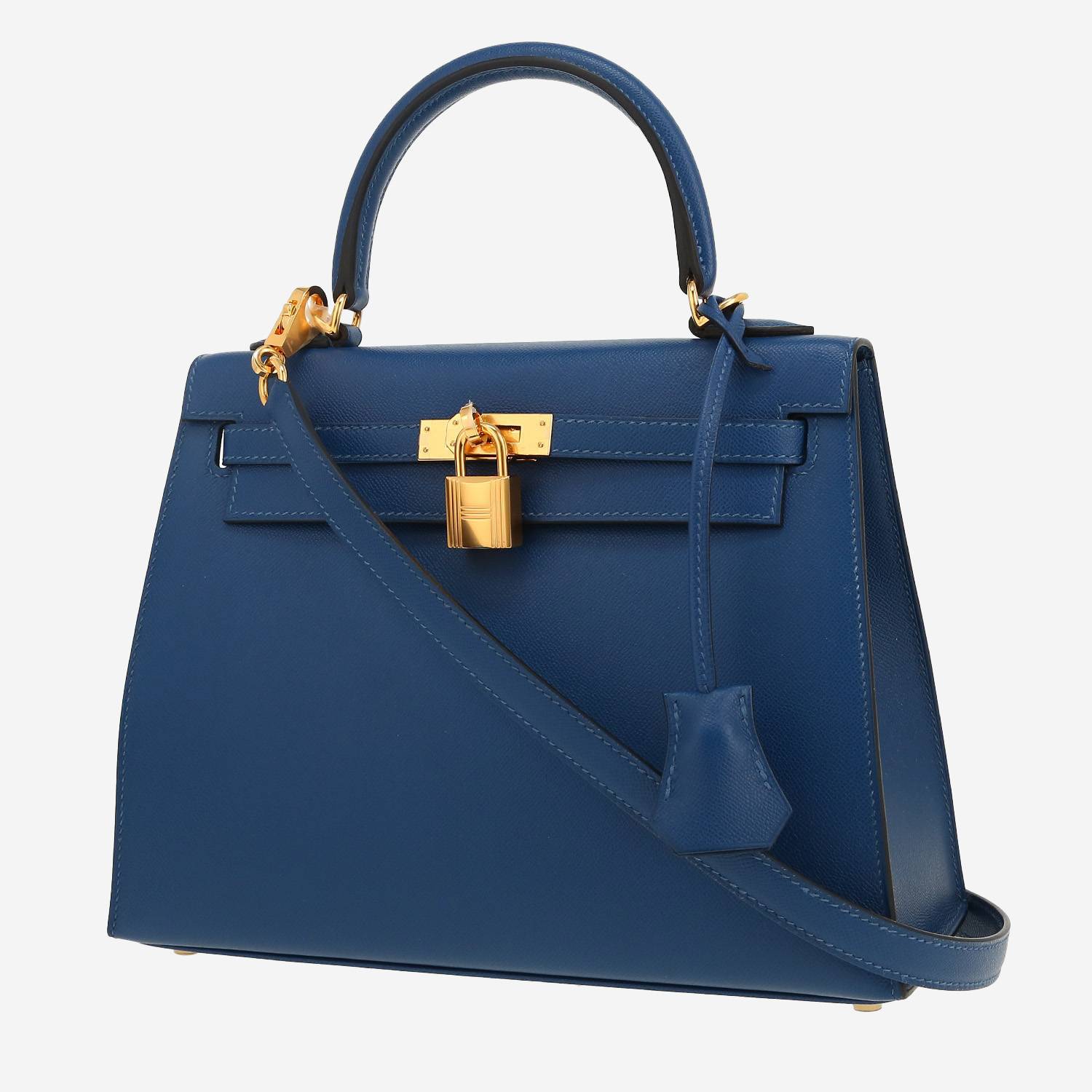 Splendida borsa Hermès Kelly 25 cm in vitello Madame blu, inserti in metallo dorato, manico semplice in pelle blu, tracolla removibile in pelle blu da portare a mano o in spalla.
