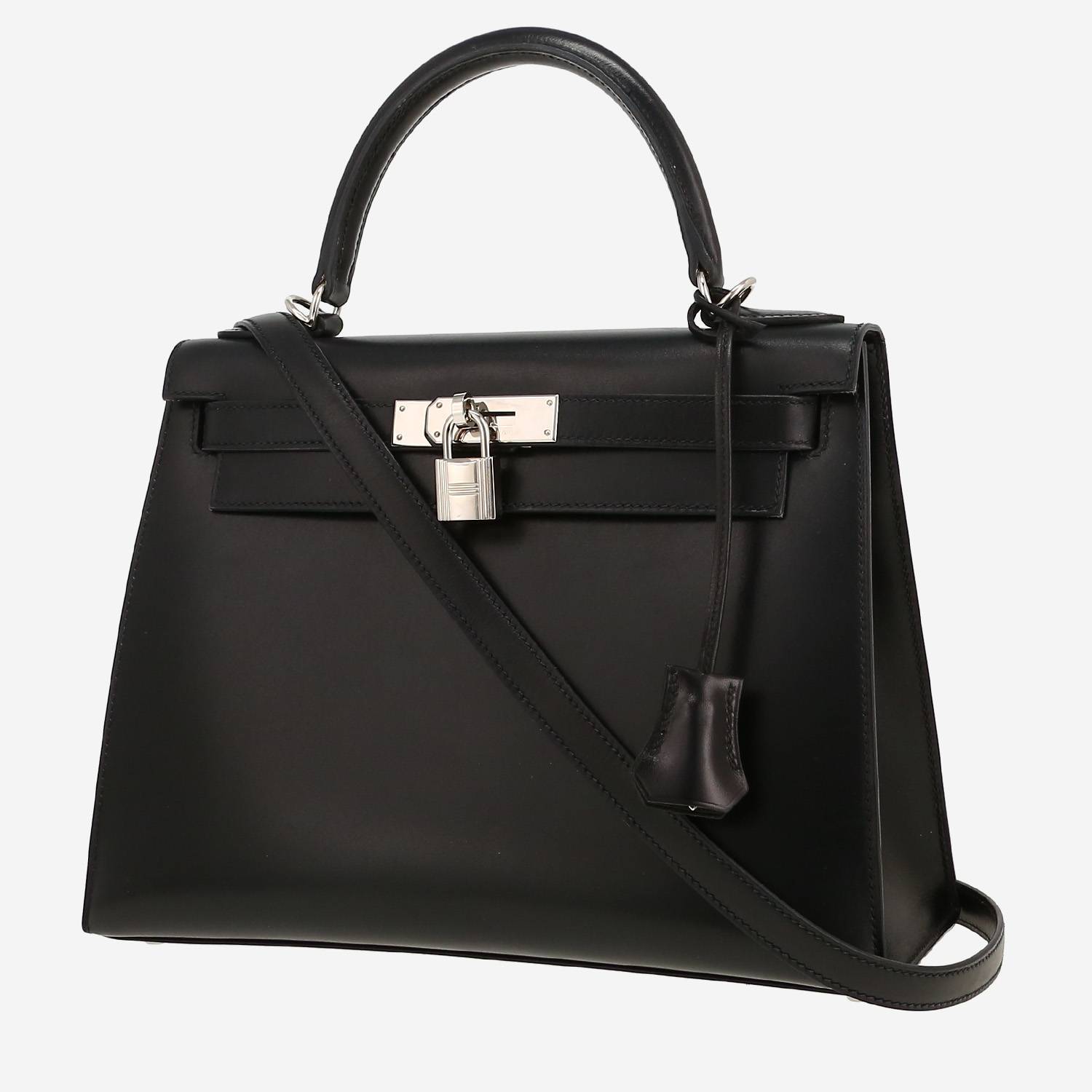 Elegante borsa Hermès Kelly 28 cm in pelle box nero, inserti in palladio, manico semplice in pelle nera, tracolla removibile in pelle nera da portare a mano o in spalla.
