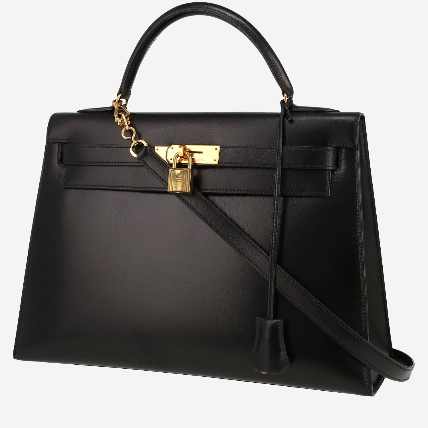 Splendida borsa Hermès Kelly 32 cm in pelle box nero, inserti in metallo dorato, manico semplice in pelle nera, tracolla removibile in pelle nera da portare a mano o in spalla.