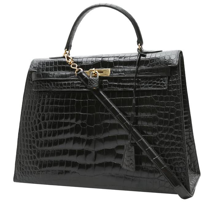 Famosa borsa Hermès Kelly 35 cm in coccodrillo marino nero, inserti in metallo dorato, manico semplice in coccodrillo nero, maniglia non firmata removibile in coccodrillo nero da portare a mano o in spalla.