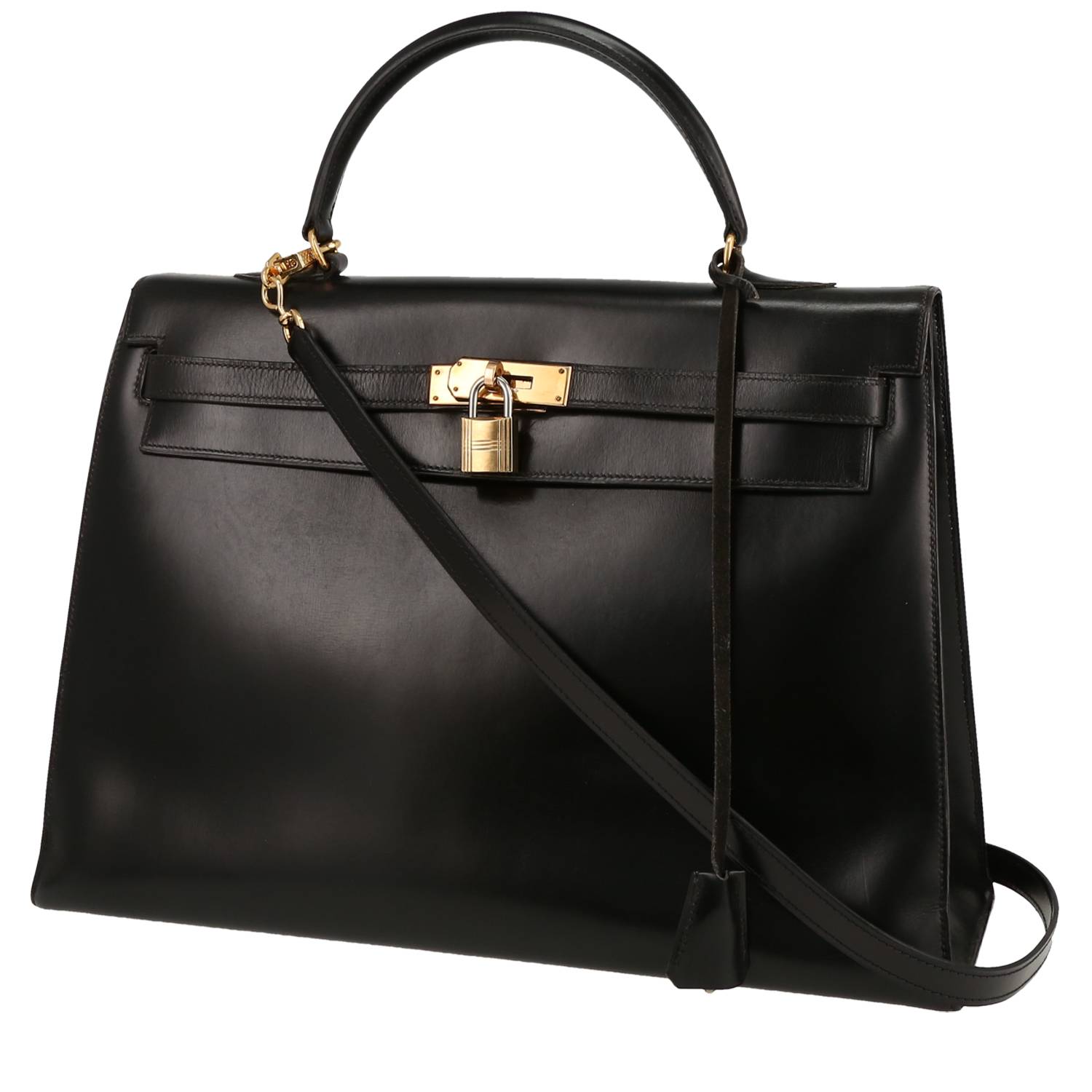 Famosa borsa Hermès Kelly 35 cm in pelle box nero, inserti in metallo dorato, manico semplice in pelle box nera, maniglia non firmata removibile in pelle nera da portare a mano o in spalla.