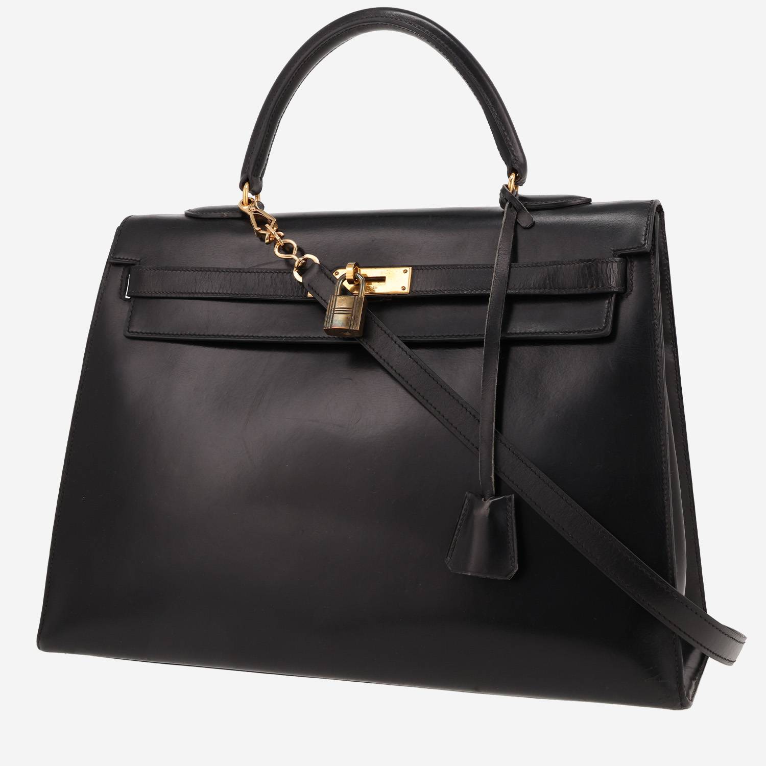 Magnifica borsa Hermès Kelly 35 cm in pelle box nero, inserti in metallo dorato, manico semplice in pelle nera, maniglia non firmata removibile in pelle nera da portare a mano o in spalla.