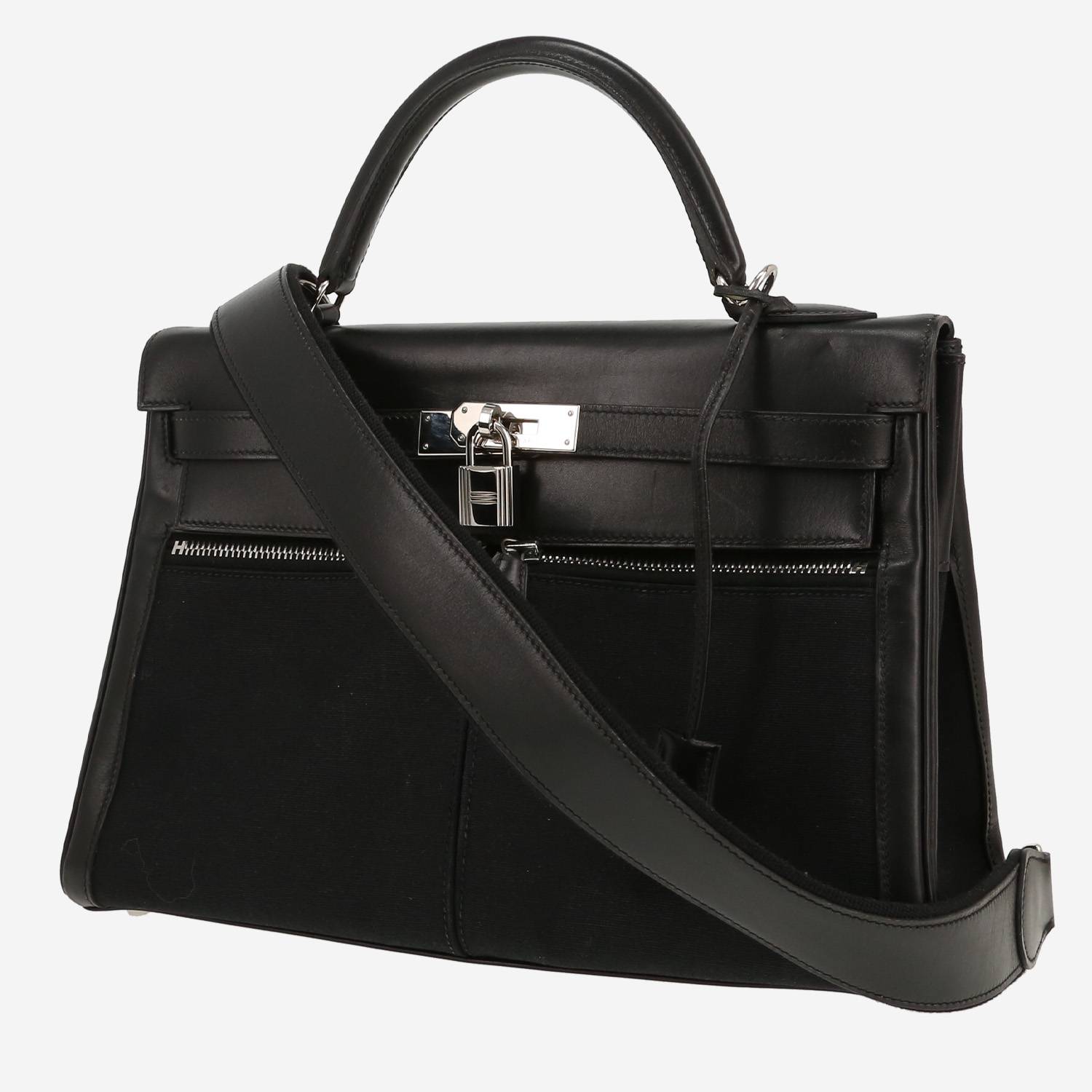 Straordinaria borsa Hermès Kelly Lakis in pelle box nero e tela nera, inserti in palladio, manico in pelle nera, tracolla removibile in pelle nera da portare a mano, in spalla o a tracolla.