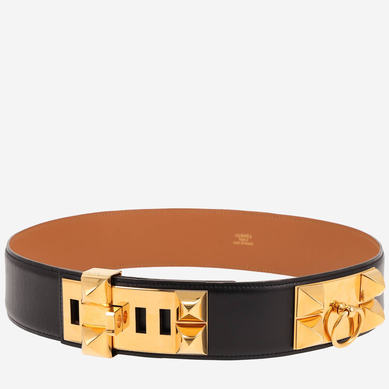 Splendida cintura Hermès Médor in pelle box nero, inserti in metallo dorato.