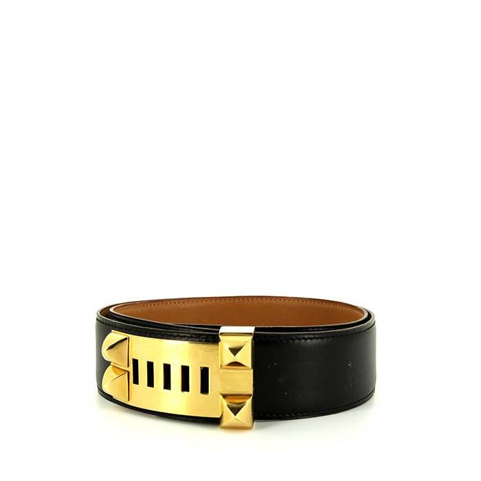 Famosa cintura "Médor" in pelle box nera, inserti in metallo dorato.
