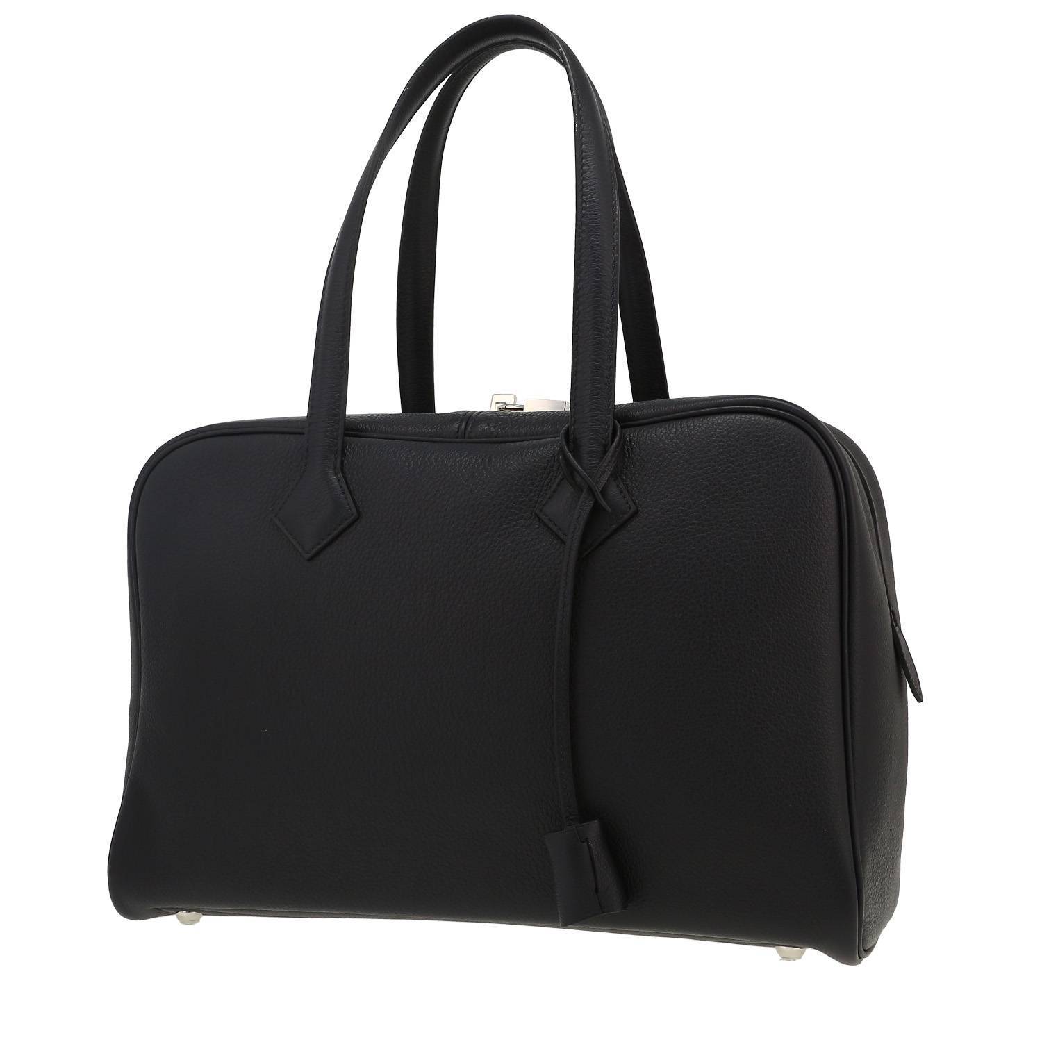 Magnifica borsa Hermès Victoria in pelle togo Bleu Caban, inserti in palladio, doppio manico in pelle Bleu Caban da portare a mano o in spalla.