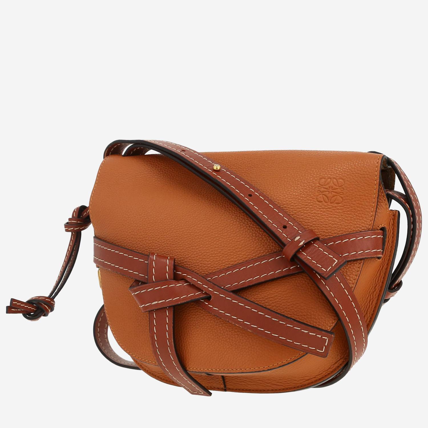 Magnifica borsa a tracolla Loewe Gate modello piccolo in pelle martellata marrone, inserti in metallo dorato, tracolla regolabile in pelle marrone da portare in spalla o a tracolla.