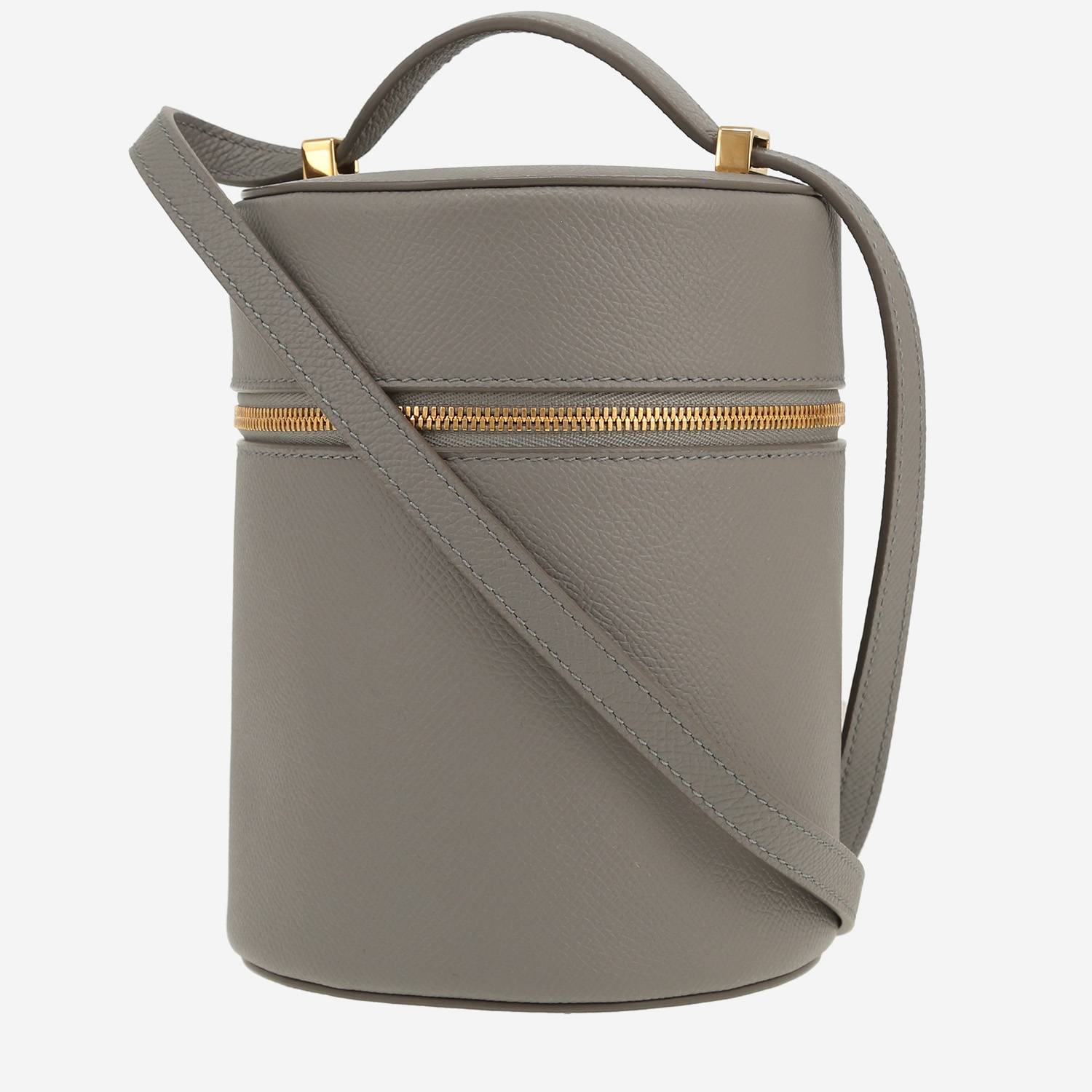 Magnifica borsa Loro Piana Extra Case in pelle martellata grigio, inserti in metallo dorato, una tracolla trasformabile in pelle grigia da portare a mano o in spalla.
