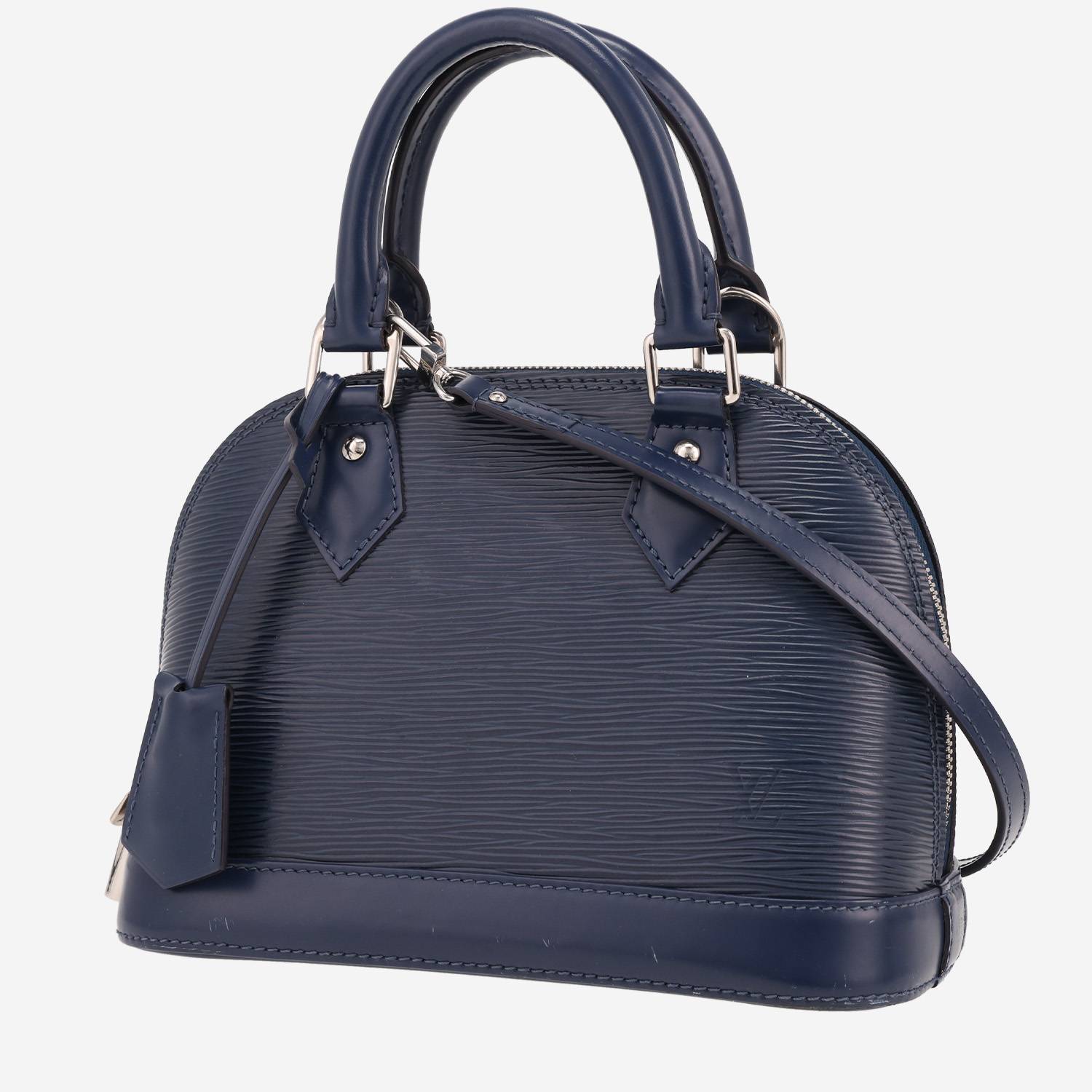 Magnifica borsa Louis Vuitton Alma BB in pelle Epi blu e pelle bordeaux, inserti in metallo argentato, doppio manico in pelle blu, tracolla removibile in pelle blu da portare a mano, in spalla o a tracolla.