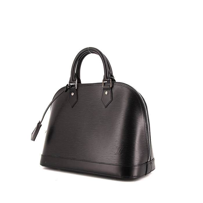 Elegante borsa Louis Vuitton Alma in pelle Epi nera, inserti in metallo argentato, doppio manico in pelle nera da portare a mano.
