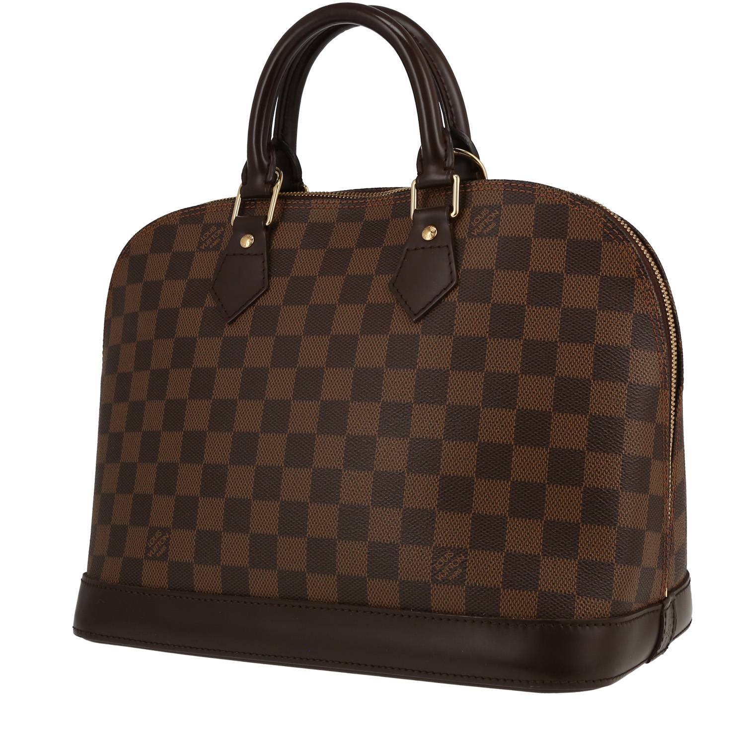 Inimitabile borsa Louis Vuitton Alma in tela a scacchi ebano e pelle marrone, inserti in metallo dorato, doppio manico in pelle marrone da portare a mano.