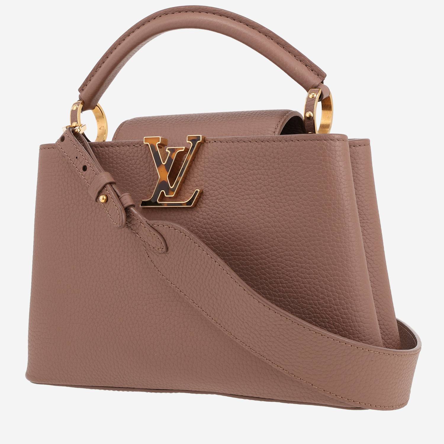 Bellissima borsa Louis Vuitton Capucines BB in pelle taurillon clemence beige rosato, inserti in metallo dorato, manico semplice in pelle beige rosato, una tracolla removibile in pelle beige rosato da portare a mano, in spalla o a tracolla.
