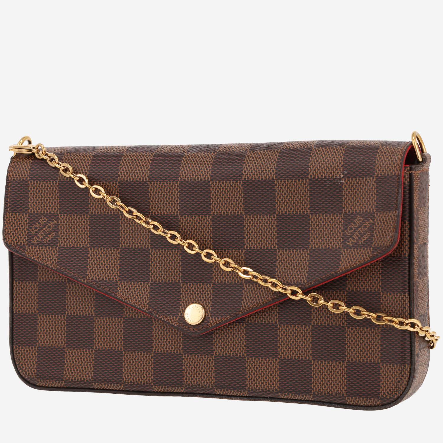 Inimitabile borsa a tracolla Louis Vuitton Félicie in tela a scacchi ebano e pelle marrone, inserti in metallo dorato, tracolla a catena removibile in metallo dorato da portare a mano, in spalla o a tracolla.