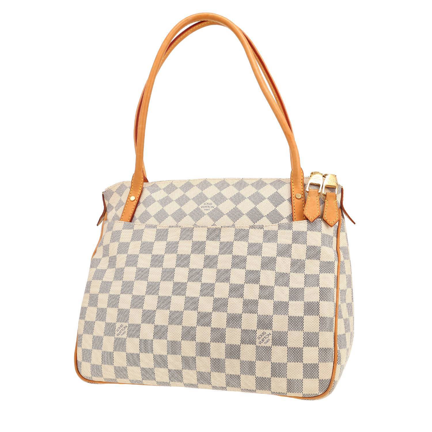 Magnifica borsa Louis Vuitton Figheri in tela a scacchi azzurro e pelle naturale, inserti in metallo dorato, doppia tracolla in pelle naturale da portare a mano o in spalla.