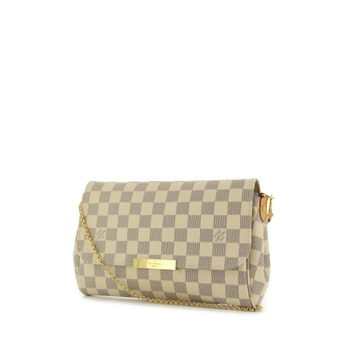 Bella borsa/pochette Louis Vuitton in tela a scacchi e pelle naturale, inserti in metallo dorato, tracolla a catena in metallo dorato da portare a mano o in spalla.