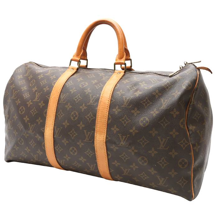 Pratica borsa da viaggio Louis Vuitton Keepall 50 in tela monogram marrone e pelle naturale, inserti in metallo dorato, doppio manico in pelle naturale da portare a mano.
