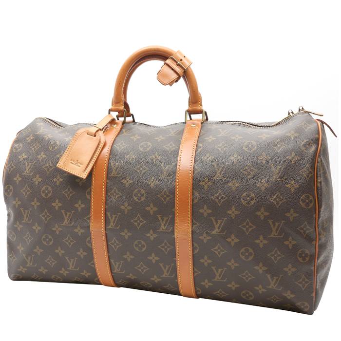 Pratica borsa da viaggio Louis Vuitton Keepall 50 in tela monogram marrone e pelle naturale, inserti in metallo dorato, doppio manico in pelle naturale da portare a mano.