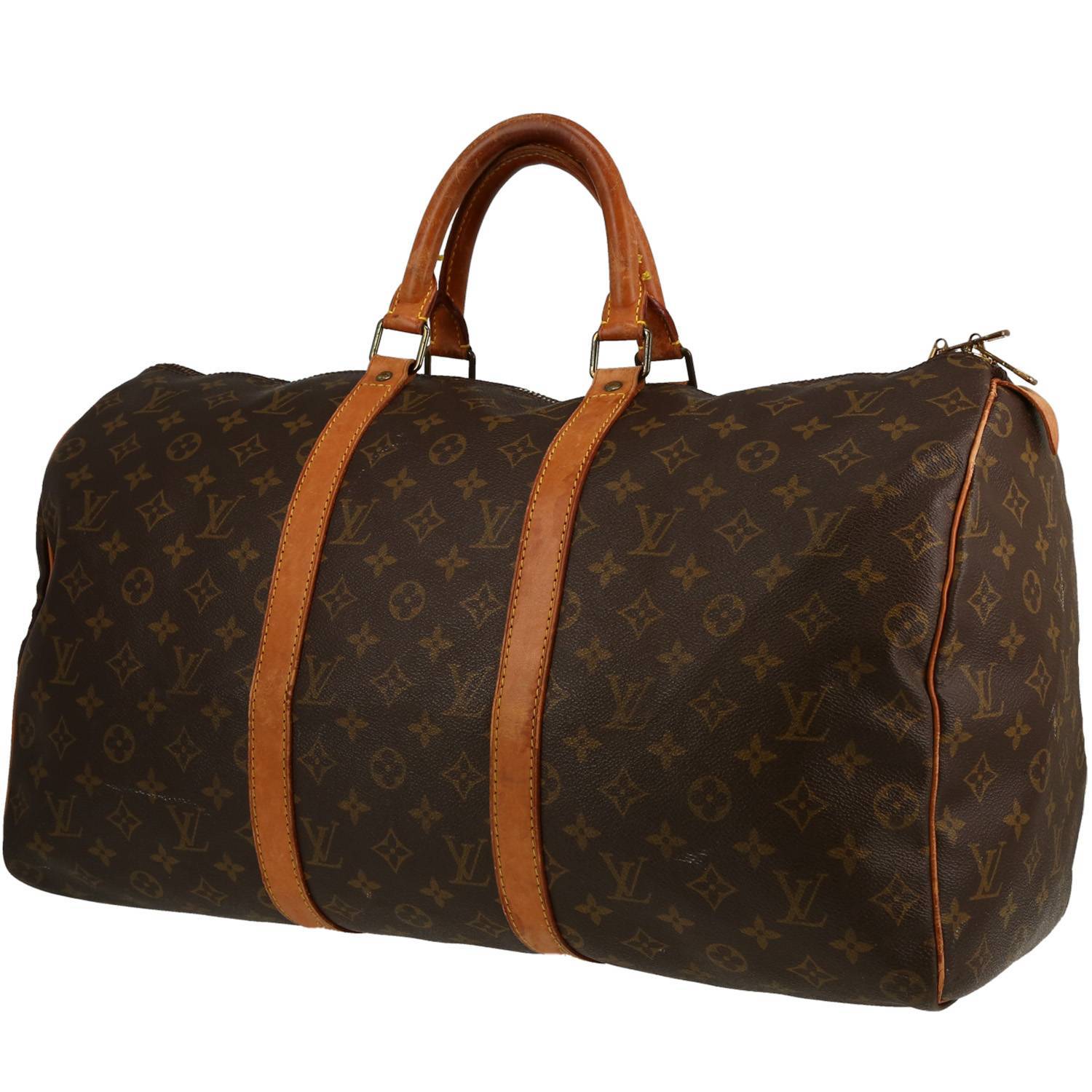 Pratica borsa da viaggio Louis Vuitton Keepall 50 in tela monogram marrone e pelle naturale, inserti in metallo dorato, doppio manico in pelle naturale da portare a mano.