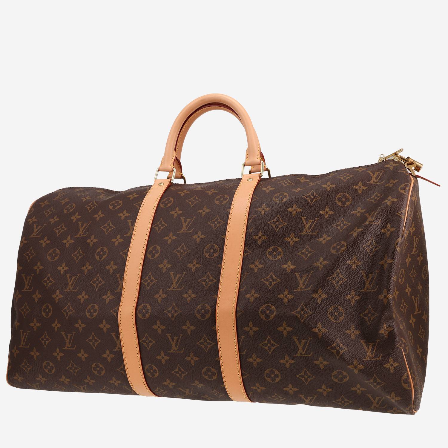 Inimitabile borsa da viaggio Louis Vuitton Keepall 55 in tela monogram marrone e pelle naturale, inserti in metallo dorato, doppio manico in pelle naturale da portare a mano.
