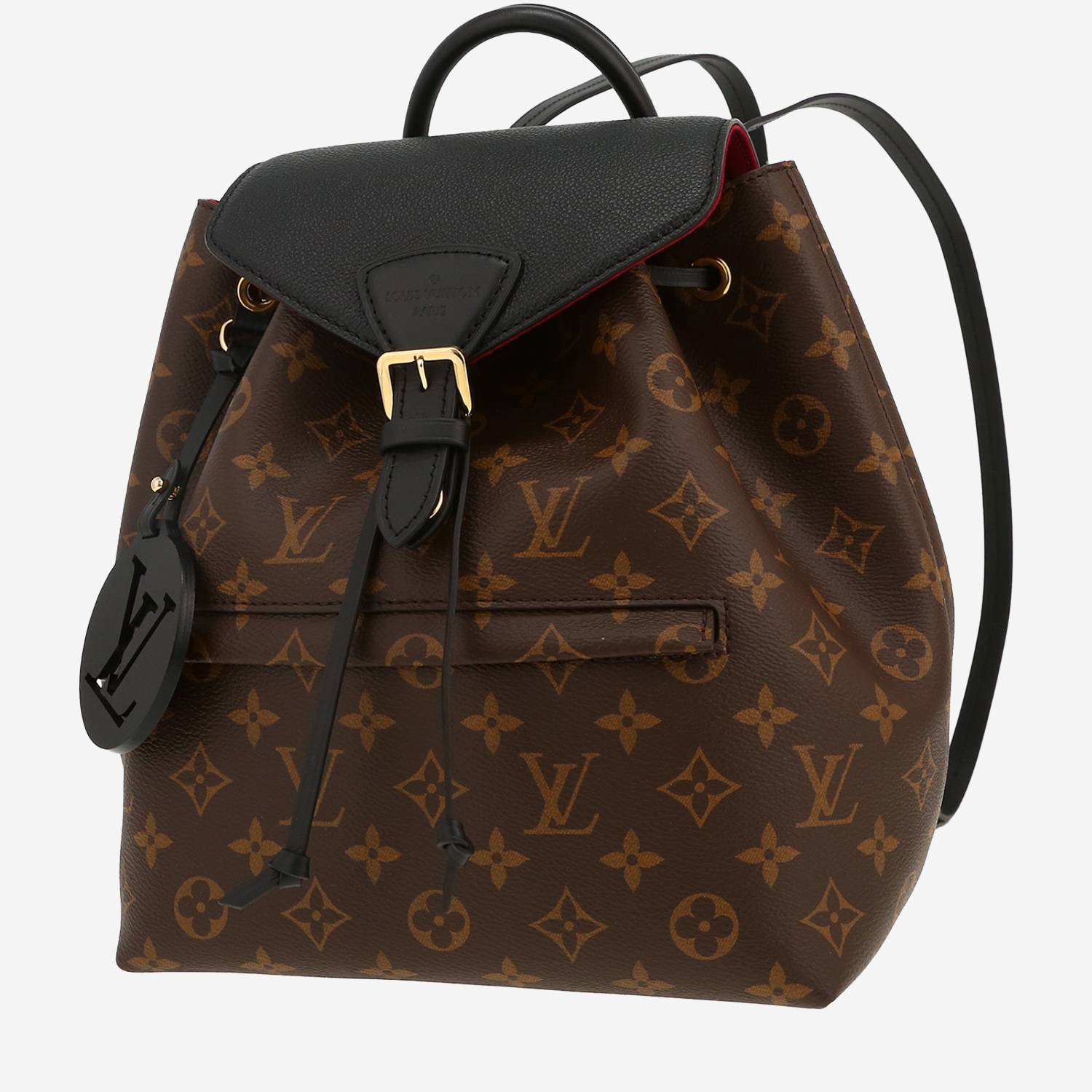 Magnifico zaino Louis Vuitton in tela monogram marrone e pelle martellata nera, inserti in metallo dorato, manico semplice in pelle nera, doppia tracolla regolabile in pelle nera da portare a mano o in spalla.