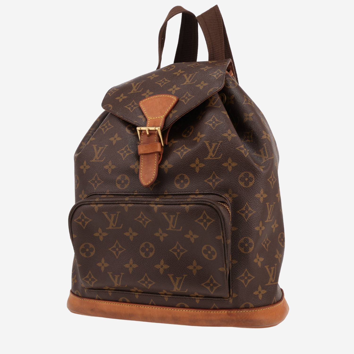 Intramontabile zaino Louis Vuitton Montsouris in tela monogram marrone e pelle naturale, inserti in metallo dorato, doppia tracolla regolabile in tela marrone da portare sulla schiena.