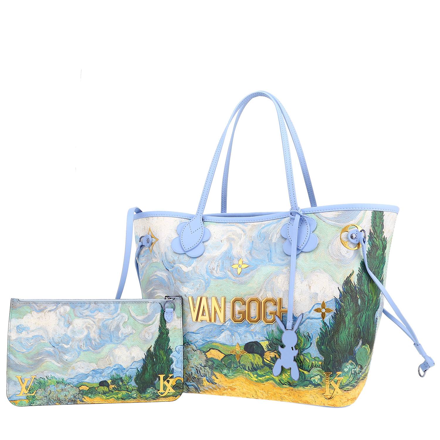 Rarissima shopping bag Louis Vuitton Neverfull Editions Limitées modello medio in pelle blu verde e gialla con motivo, inserti in metallo dorato, doppia tracolla semplice in pelle blu da portare a mano o in spalla.