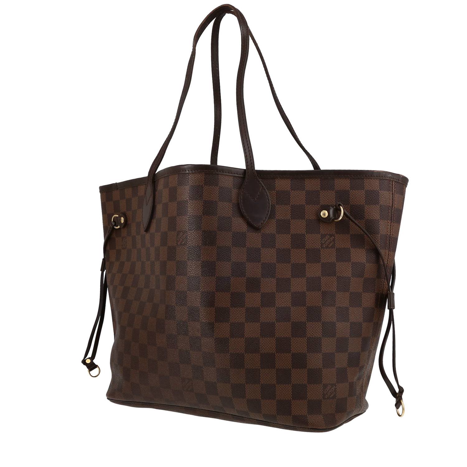 Inimitabile shopping bag Louis Vuitton Neverfull in tela a scacchi ebano e pelle marrone, inserti in metallo dorato, doppia tracolla in pelle marrone da portare a mano o in spalla.