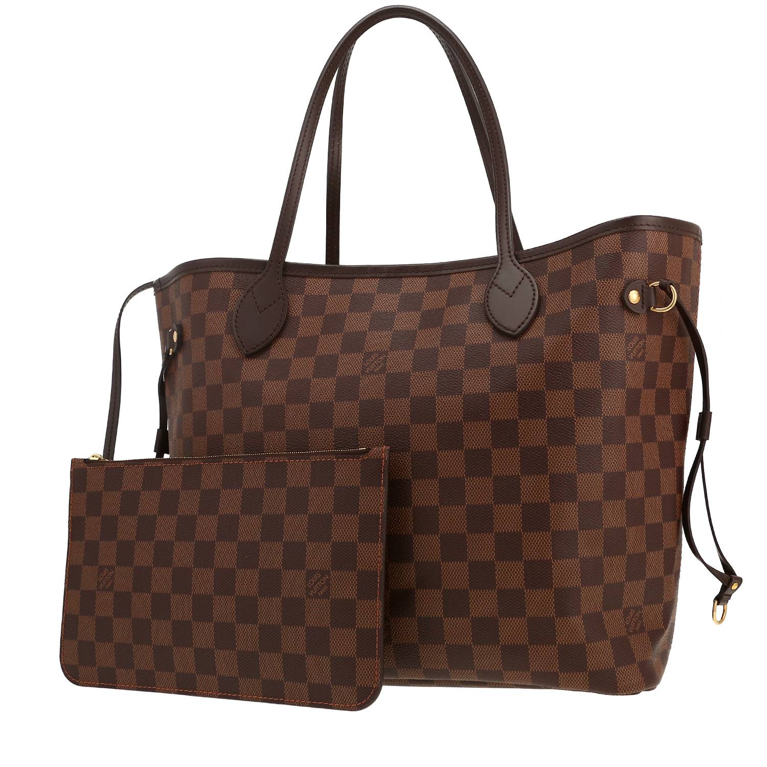 Splendida shopping bag Louis Vuitton Neverfull in tela a scacchi ebano e pelle marrone, inserti in metallo dorato, doppia tracolla in pelle marrone da portare a mano o in spalla.
