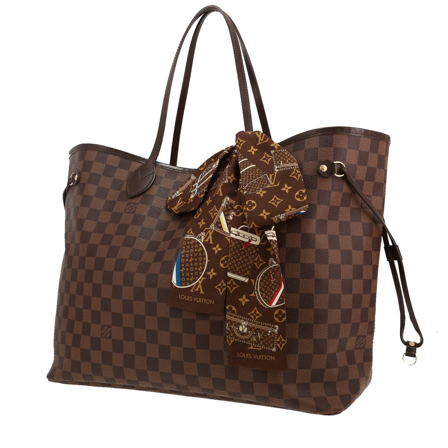 Splendida shopping bag Louis Vuitton Neverfull modello grande in tela a scacchi ebano e pelle marrone, inserti in metallo dorato, doppia tracolla in pelle marrone da portare a mano o in spalla.