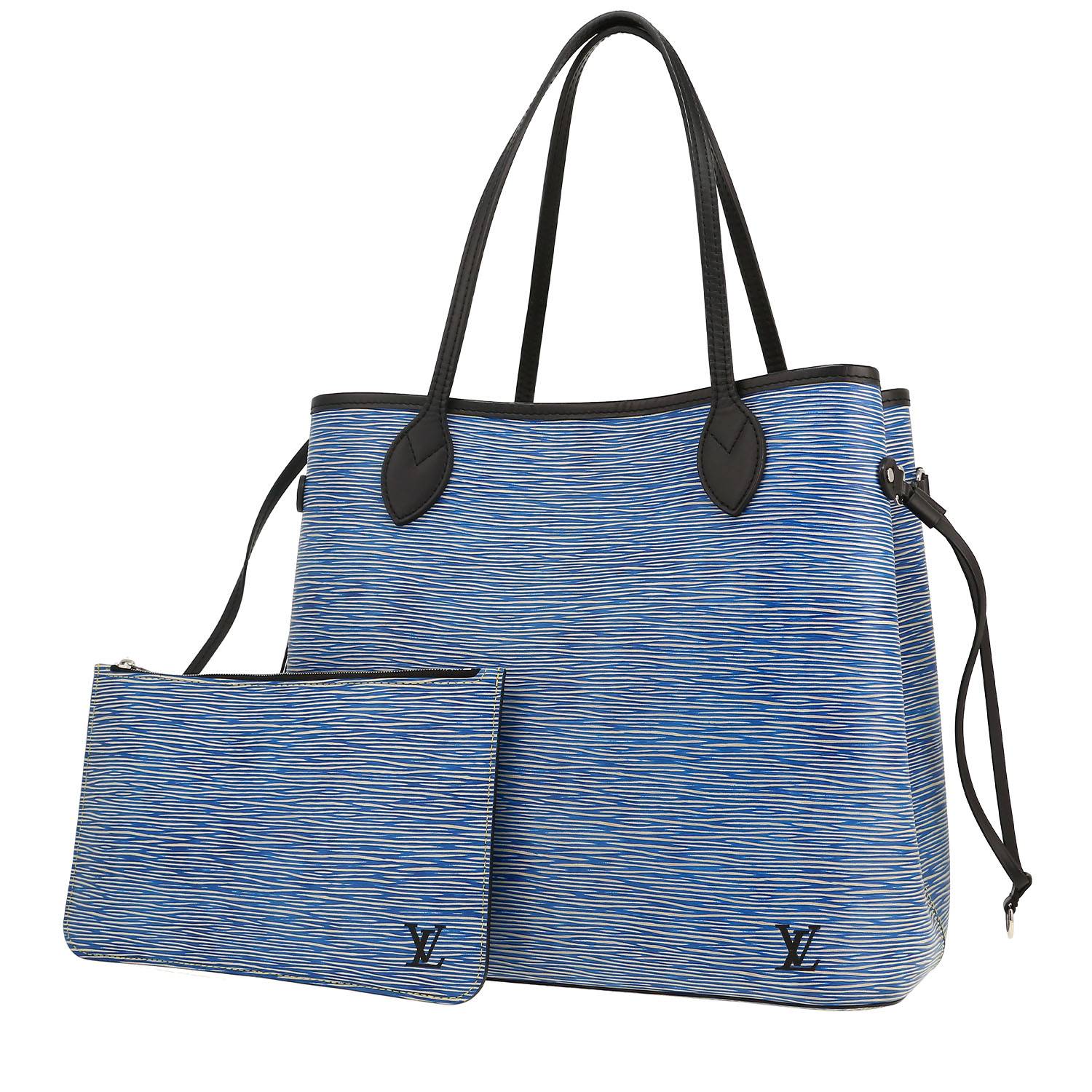 Inimitabile shopping bag Louis Vuitton Neverfull modello medio in pelle Epi blu, inserti in metallo argentato, doppia tracolla in pelle Epi nera da portare a mano o in spalla.