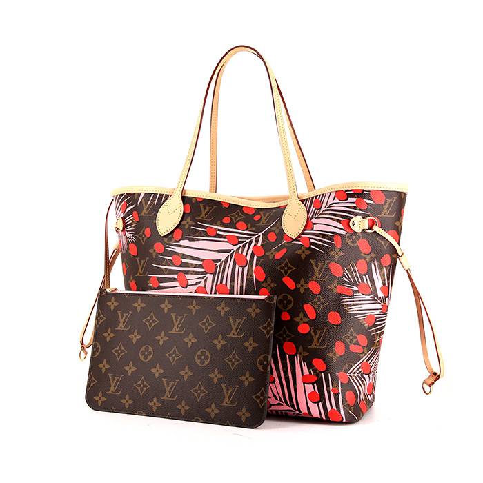 Straordinaria shopping bag Louis Vuitton Neverfull modello medio in tela monogram marrone a fiori e pelle naturale, inserti in metallo dorato, doppio manico in pelle naturale da portare a mano o in spalla.