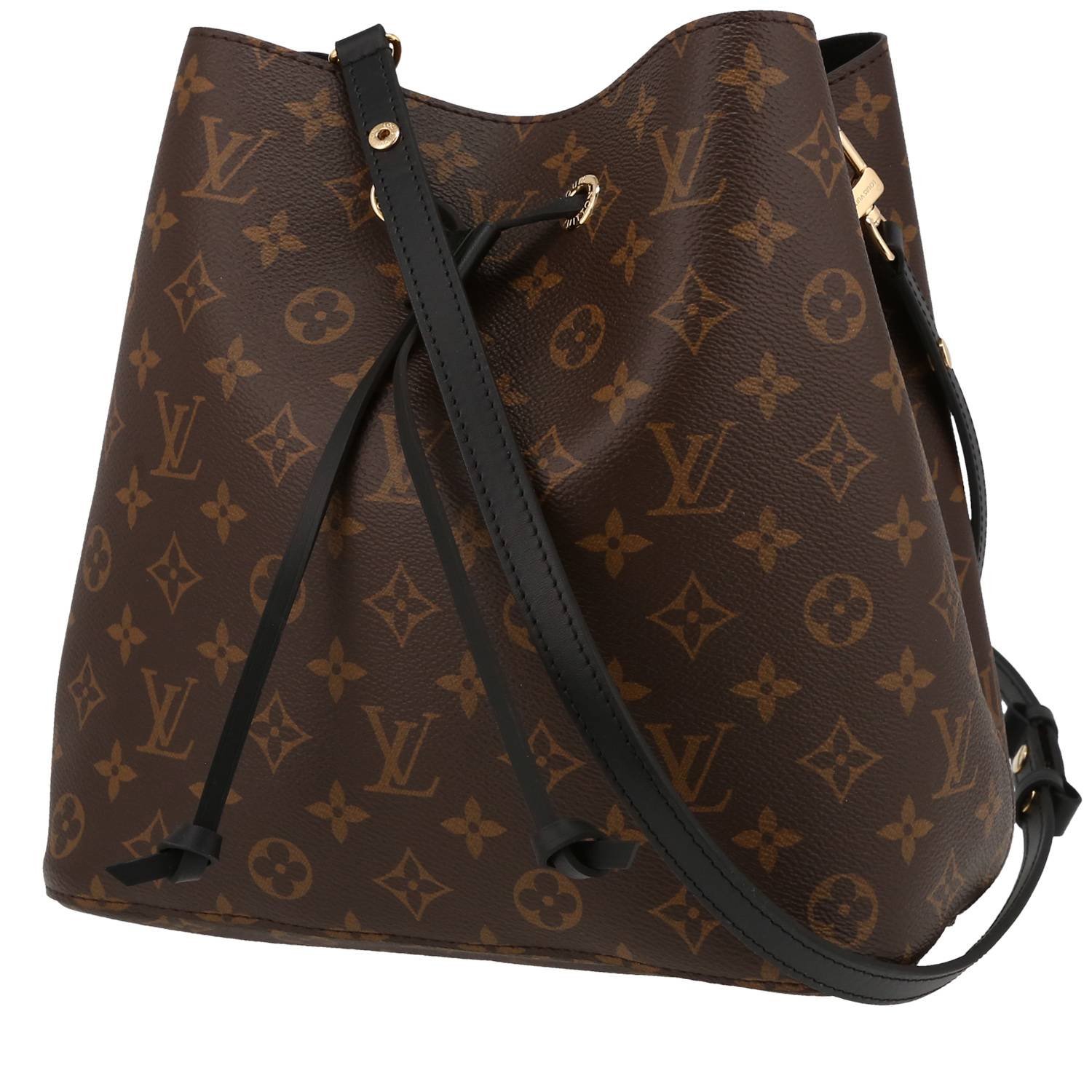 Bella e rara borsa a spalla Louis Vuitton NéoNoé in tela monogram e pelle nera, inserti in metallo dorato, tracolla trasformabile in pelle nera da portare a mano, in spalla o a tracolla.