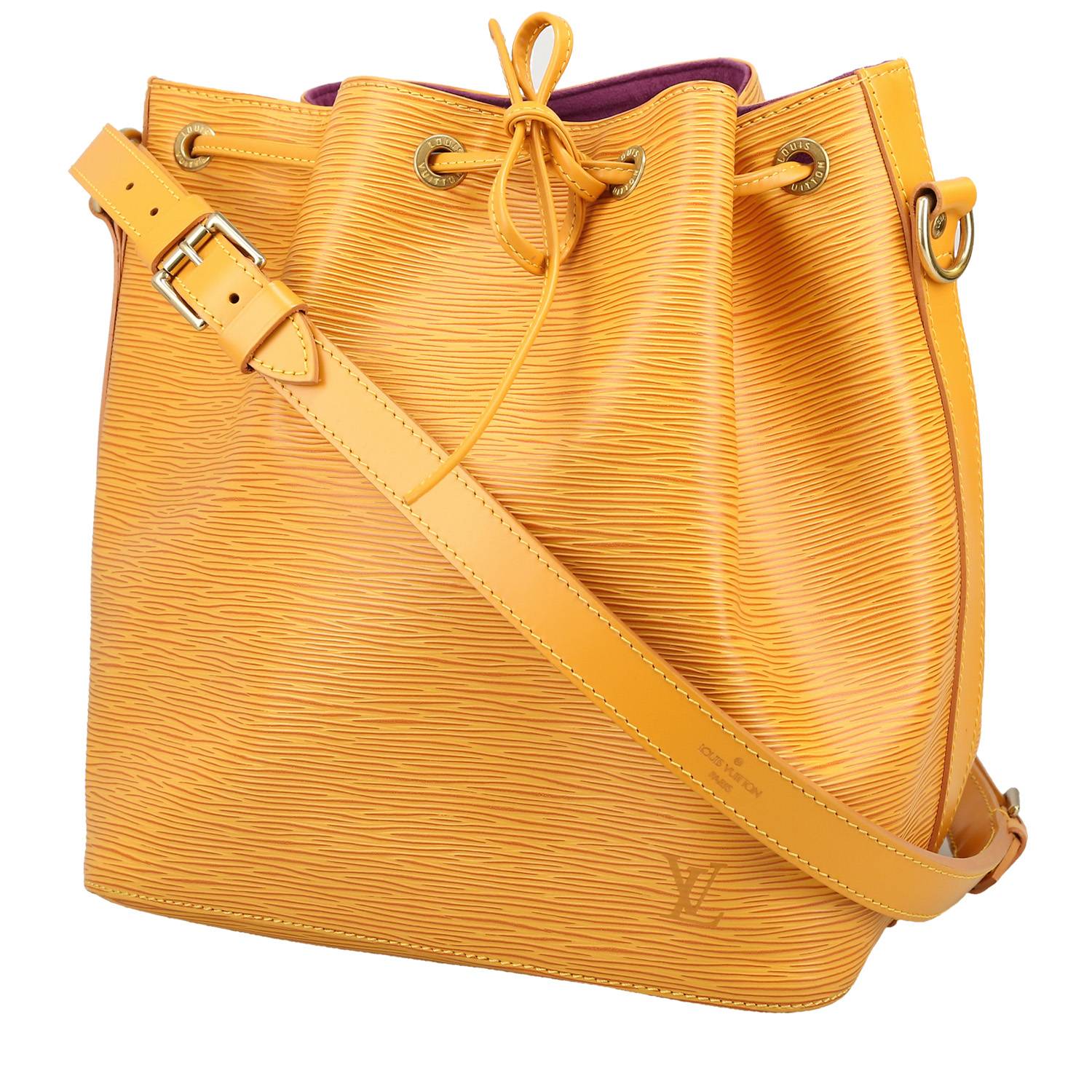 Inimitabile borsa Louis Vuitton Noé in pelle Epi giallo, inserti in metallo dorato, tracolla trasformabile in pelle gialla da portare in spalla.