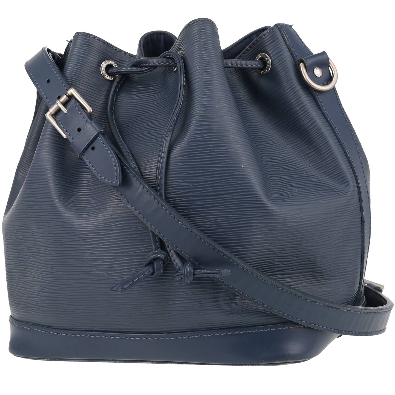 Inimitabile shopping bag Louis Vuitton Noé modello piccolo in pelle Epi blu, inserti in metallo argentato, tracolla trasformabile in pelle blu da portare in spalla.