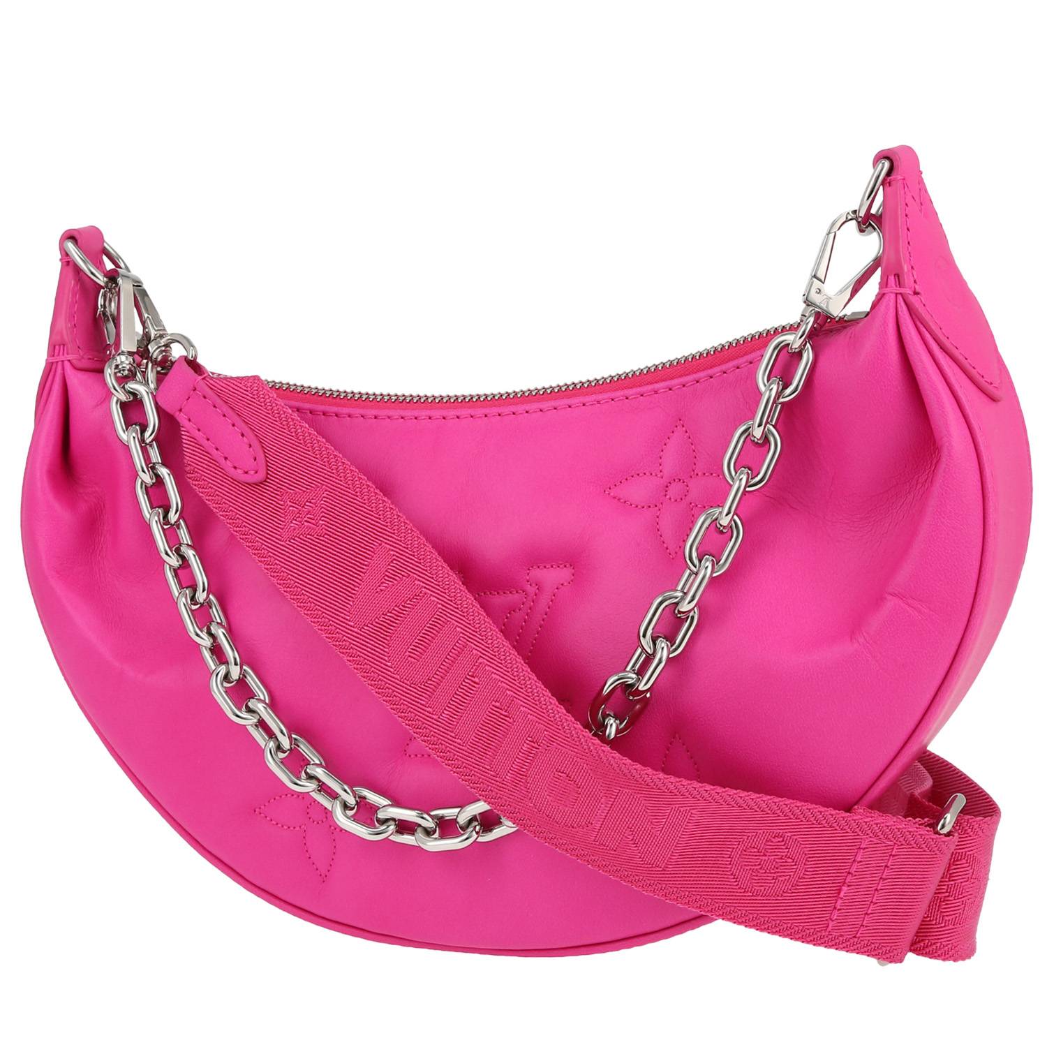 Bellissima borsa Louis Vuitton Over The Moon in pelle monogram rosa, inserti in metallo argentato, una tracolla a catena in metallo argentato, tracolla rimovibile regolabile in tela rosa da portare a mano, in spalla o a tracolla.