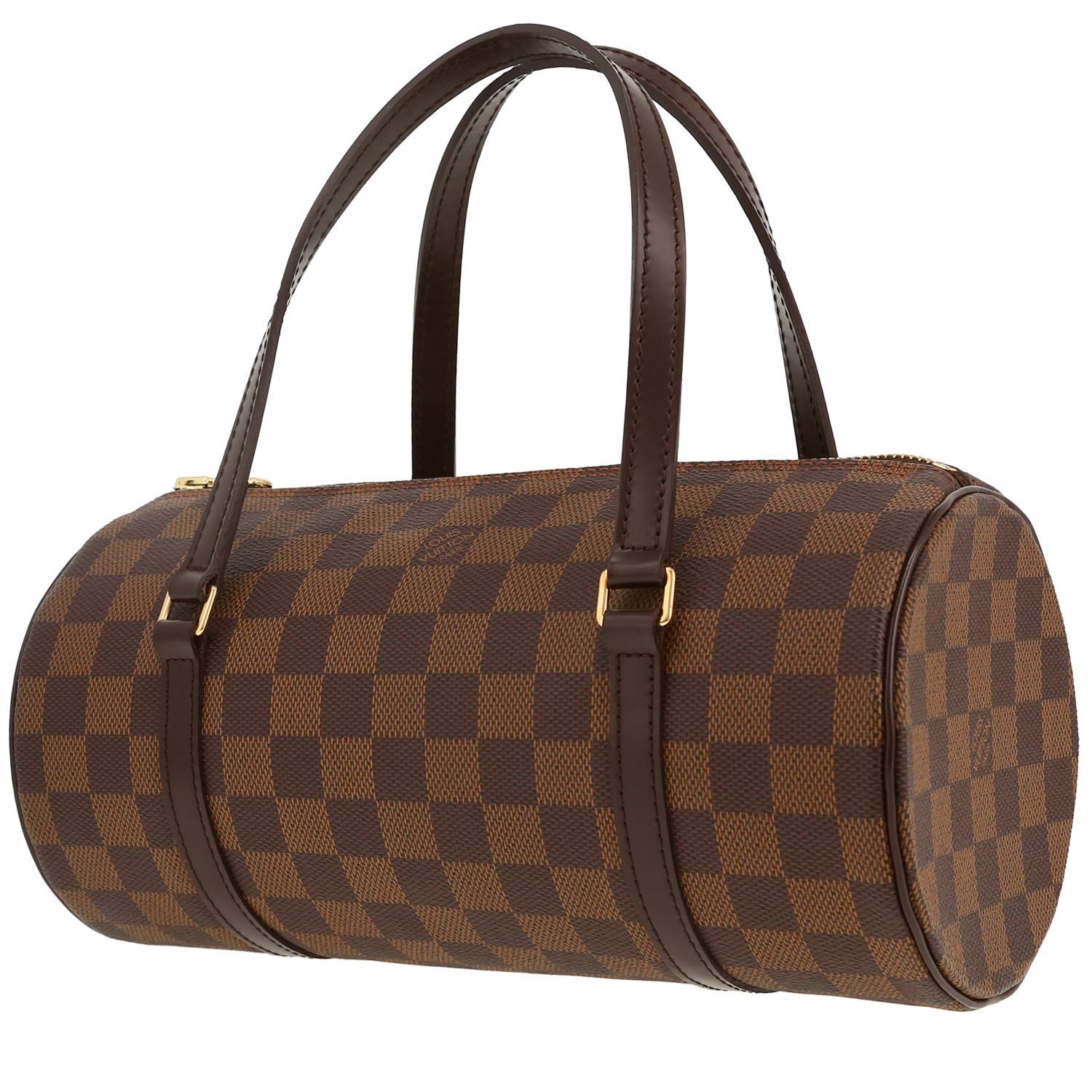 Divertente borsa Louis Vuitton Papillon in tela a scacchi ebano e pelle marrone, inserti in metallo dorato, doppio manico in pelle marrone da portare a mano o in spalla.