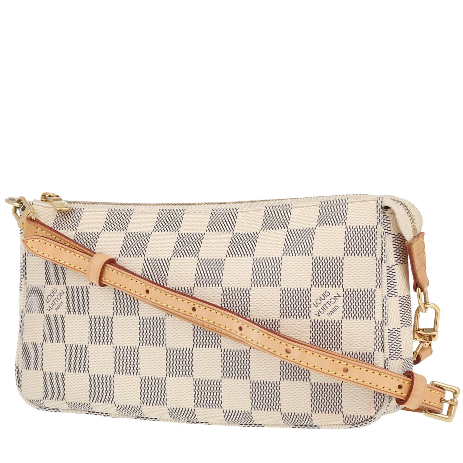 Famosa borsa a tracolla Louis Vuitton Pochette accessoires in tela a scacchi azzurro e pelle naturale, inserti in metallo dorato, una tracolla regolabile in pelle naturale da portare a mano, in spalla o a tracolla.