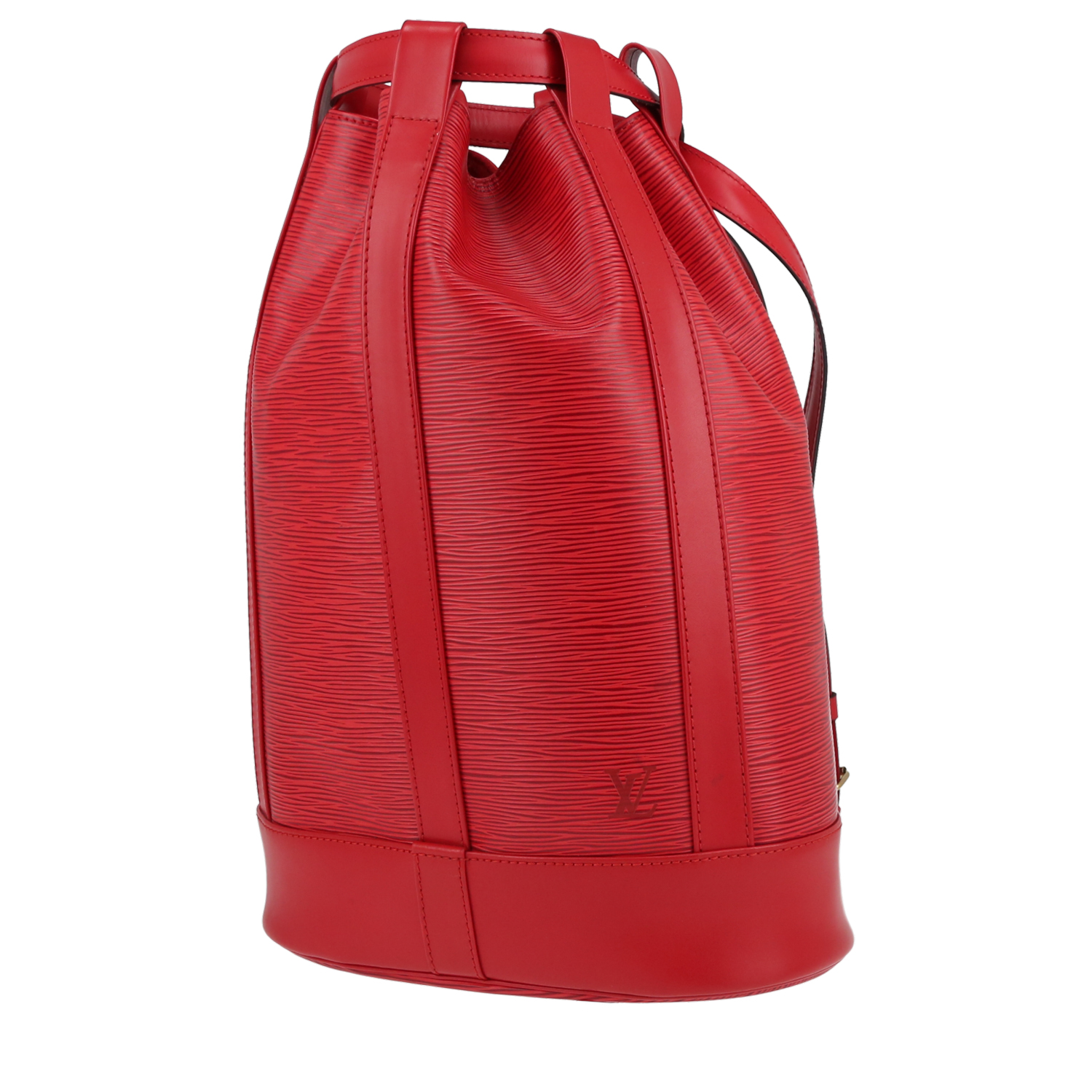 Pratico zaino Louis Vuitton Randonnée in pelle Epi rosso, inserti in metallo dorato, una tracolla regolabile in pelle rossa da portare a mano.