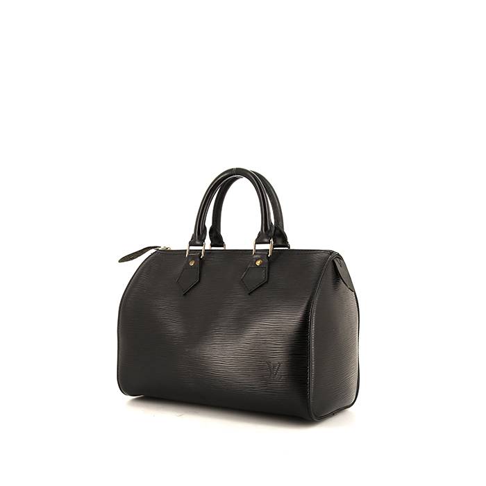 Raffinata borsa Louis Vuitton Speedy 25 cm in pelle Epi nera, inserti in metallo dorato, doppio manico in pelle nera da portare a mano.