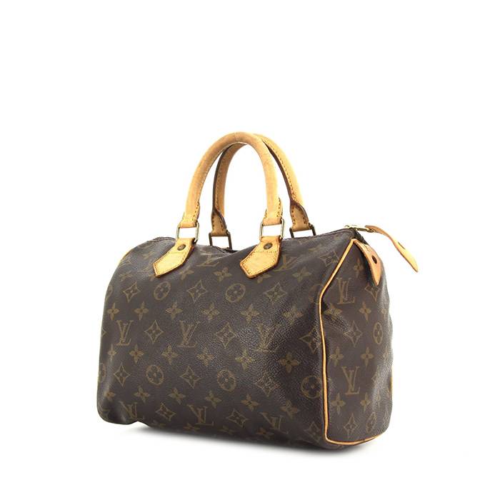 Famosa borsa Louis Vuitton Speedy 25 cm in tela monogram cerata e pelle naturale, inserti in metallo dorato, doppio manico in pelle naturale da portare a mano.