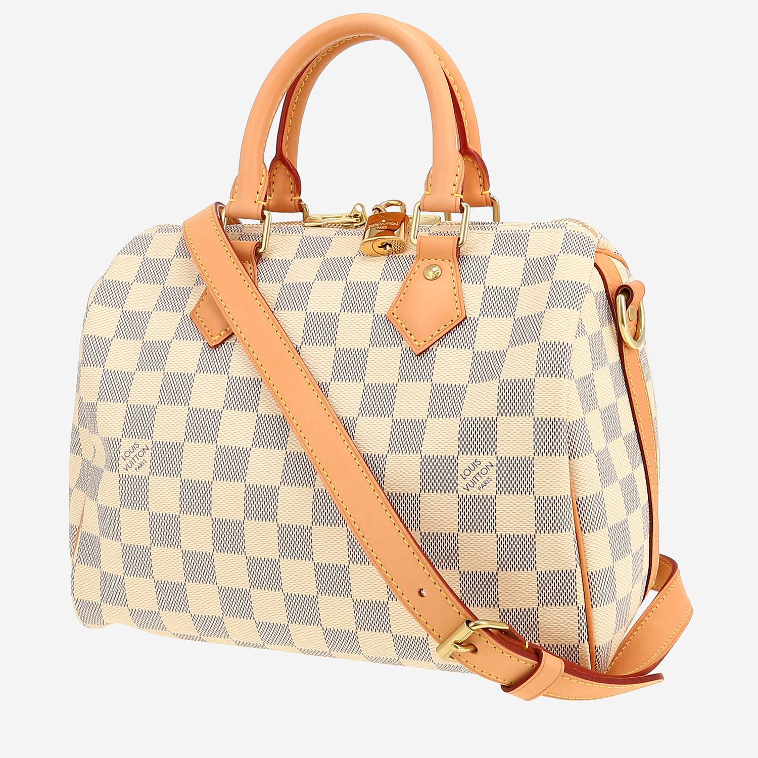 Intramontabile borsa Louis Vuitton Speedy 25 in tela a scacchi azzurro e pelle naturale, inserti in metallo dorato, doppio manico in pelle naturale, tracolla rimovibile regolabile in pelle naturale da portare a mano o in spalla.