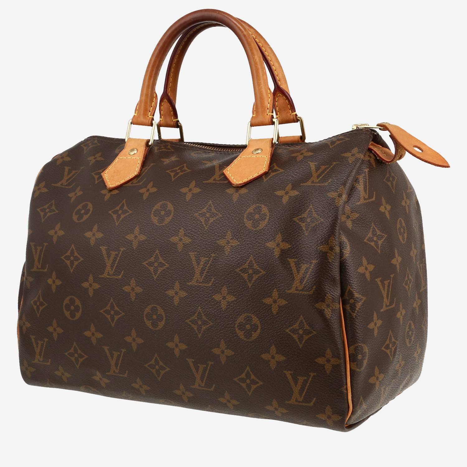Magnifica borsa Louis Vuitton Speedy 30 in tela monogram marrone e pelle naturale, inserti in metallo dorato, doppio manico in pelle naturale da portare a mano.