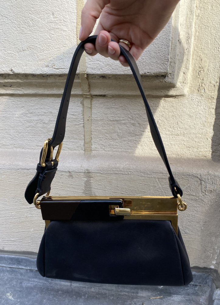 Descrizione : MARNI Sac pochette 23cm en cuir lisse noir, fermoir rigide en métal doré et baccalite noir, marron, poignée réglable en cuir en coordonné. BE (légères usures, égrénures)Leggi la descrizione dell'espertoMARNI Sac pochette 23cm en cuir lisse noir,... - Lot 213 - Gros & Delettrez