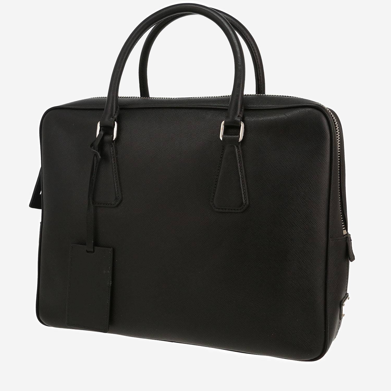 Pratica borsa portadocumenti Prada in pelle saffiano nero, inserti in metallo argentato, doppio manico in pelle nera da portare a mano.
