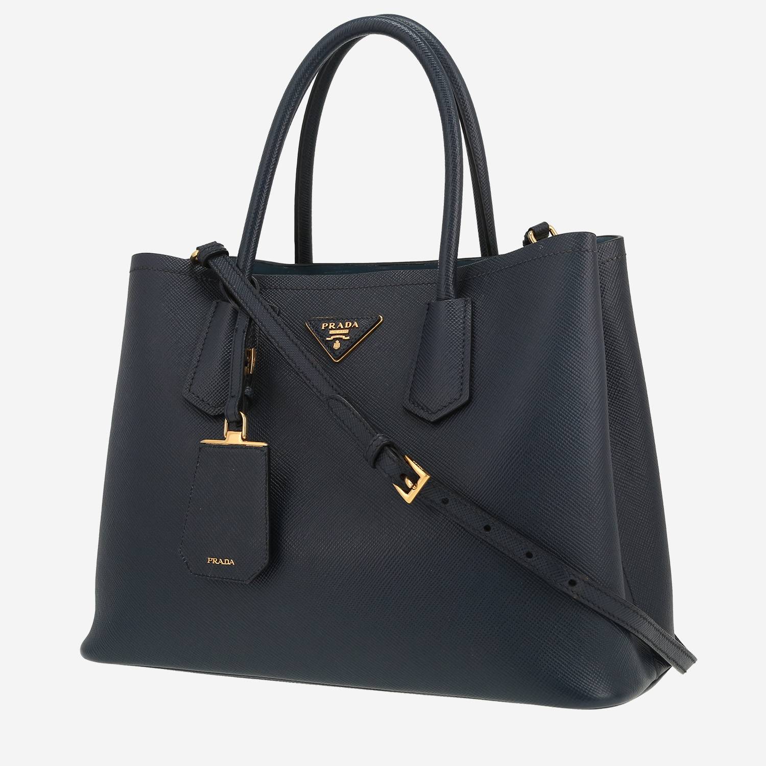 Magnifica borsa Prada Double in pelle saffiano blu, inserti in metallo dorato, doppio manico in pelle saffiano blu, tracolla removibile in pelle blu da portare a mano, in spalla o a tracolla.