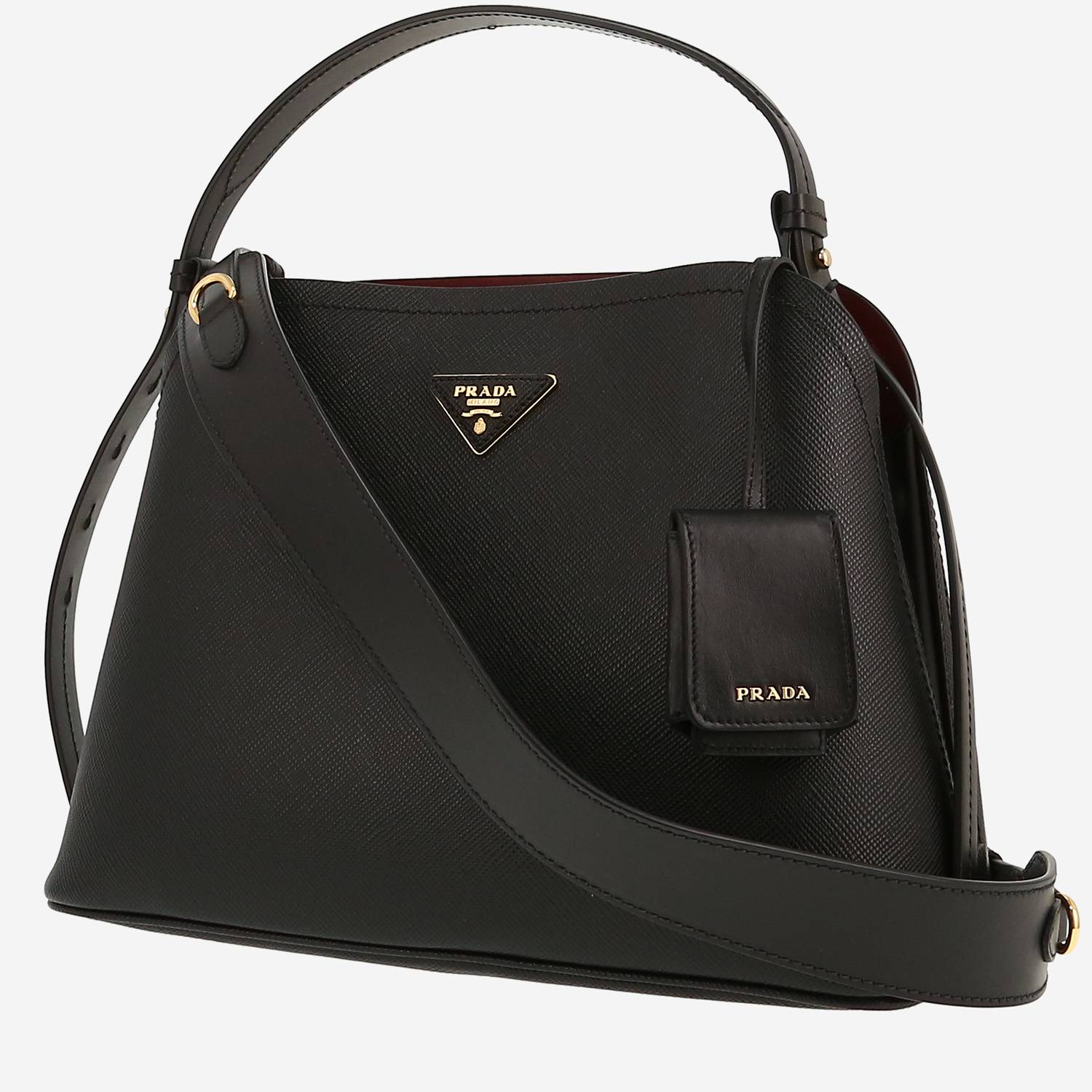 Magnifica borsa a tracolla Prada Matinée in pelle saffiano nero, inserti in metallo dorato, una tracolla regolabile in pelle nera, tracolla rimovibile regolabile in pelle nera da portare a mano, in spalla o a tracolla.