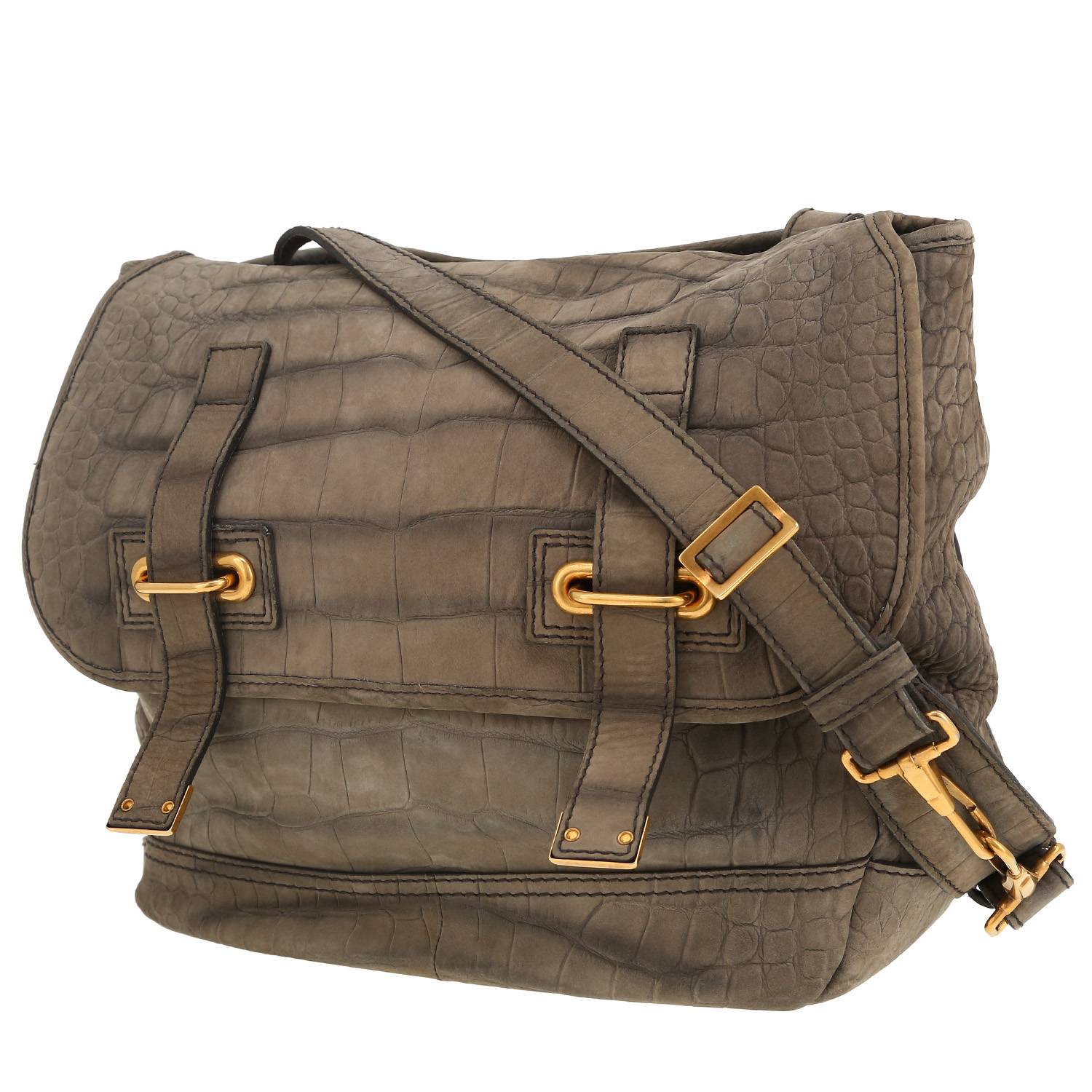 Incantevole borsa Saint Laurent Besace Messenger in Veau velours grigio simil coccodrillo, inserti in metallo dorato, una tracolla semplice regolabile in Veau velours grigio simil coccodrillo da portare a mano o in spalla.