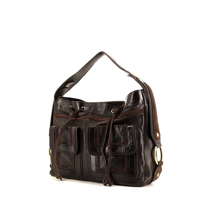 Borsa da spalla o a mano Saint Laurent in pelle verniciata marrone e pelle marrone, inserti in metallo dorato, una tracolla in pelle marrone da portare a mano o in spalla.