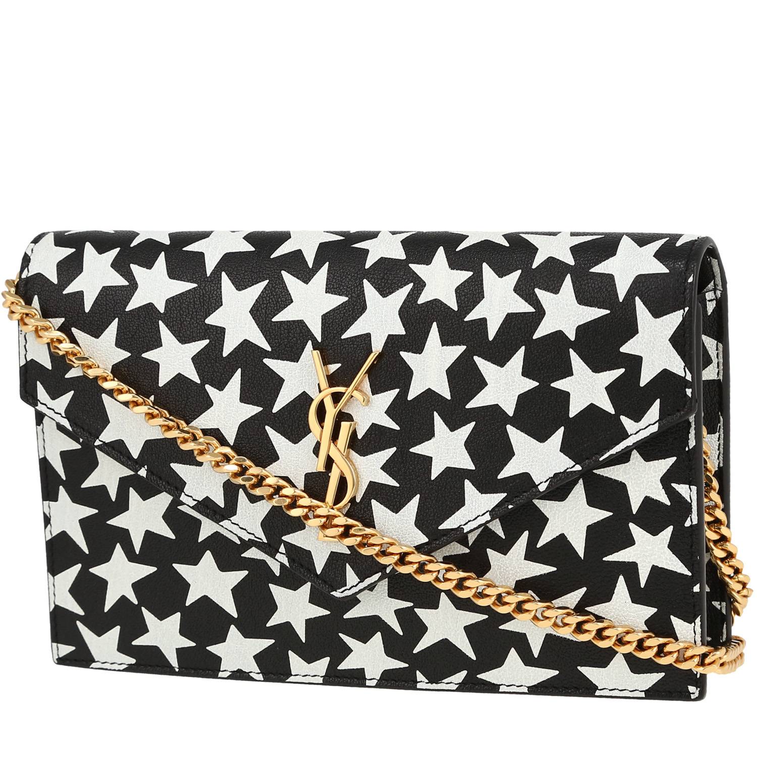 Graziosa e originale borsa a tracolla Saint Laurent Cassandre in pelle nera e bianca con motivo stellato, inserti in metallo dorato, una tracolla a catena in metallo dorato da portare a mano, in spalla o a tracolla.